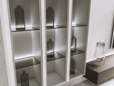» Aluglastüren in Korpusfarbe für den Einsatz im Regalsystem.