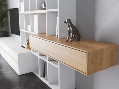 » 1-Raster Hängeelemente in Front und Korpus in den Edelfurnierausführungen Eiche Satin Natur, Wildeiche Natur oder Nussbaum Natur.